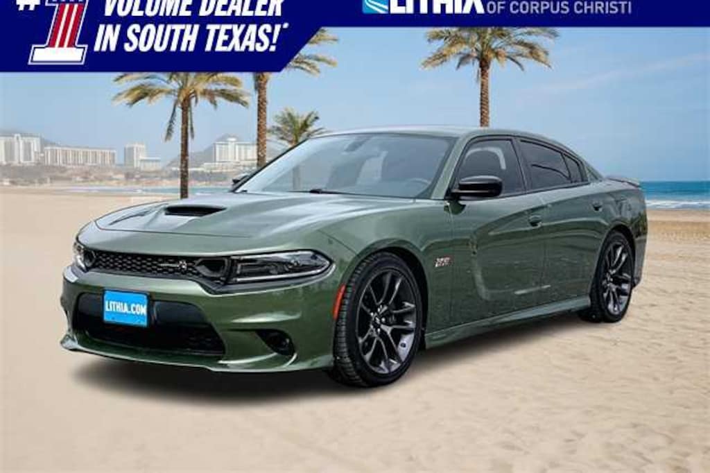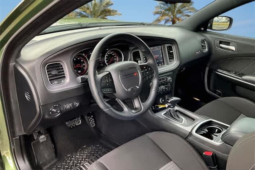 FRESH OIL CHANGE, Black Cloth, 1-Yr SiriusXM Guardian Trial, 2-Piece Shark Fin Antenna, 4-Wheel Disc Brakes, 4G LTE Wi-Fi Hot Spot, 6 Speakers, 8.4 Touchscreen Display, ABS brakes, Air Conditioning, Alloy wheels, AM/FM radio: SiriusXM, Anti-whiplash front head restraints, Apple CarPlay, Apple CarPlay/Android Auto, Auto-dimming Rear-View mirror, Automatic temperature control, Brake assist, Bumpers: body-color, Cloth Performance Seats w/Heat, Compass, Delay-off headlights, Driver door bin, Driver vanity mirror, Dual front impact airbags, Dual front side impact airbags, Electronic Stability Control, Emergency communication system: SiriusXM Guardian, For Details, Visit DriveUconnect.com, Four wheel independent suspension, Front anti-roll bar, Front Bucket Seats, Front Center Armrest, Front dual zone A/C, Front fog lights, Front License Plate Bracket, Front reading lights, Fully automatic headlights, Garage door transmitter: HomeLink, Google Android Auto, GPS Antenna Input, HD Radio, Heated door mirrors, Heated Front Seats, Heated front seats, Heated steering wheel, Illuminated entry, Integrated Center Stack Radio, Integrated Voice Command w/Bluetooth, Knee airbag, Leather Shift Knob, Low tire pressure warning, Media Hub (2 USB, AUX), Occupant sensing airbag, Outside temperature display, Overhead airbag, Overhead console, Panic alarm, ParkView Rear Back-Up Camera, Passenger door bin, Passenger vanity mirror, Power 2-Way Driver Lumbar Adjust, Power door mirrors, Power driver seat, Power steering, Power windows, Quick Order Package 21W Scat Pack, Radio: Uconnect 4C w/8.4 Display, Rear anti-roll bar, Rear Armrest w/Cupholder Seat, Rear reading lights, Rear seat center armrest, Rear window defroster, Remote keyless entry, Security system, Speed control, Speed-Sensitive Wipers, Split folding rear seat, Spoiler, Sport steering wheel, Steering wheel mounted audio controls, Tachometer, Telescoping steering wheel, Tilt steering wheel, Traction control, Trip computer, USB Host Flip, Variably intermittent wipers, Wheels: 20 x 9 Lo Gloss Granite Crystal, Black Cloth. Recent Arrival! Odometer is 17617 miles below market average! F8 Green 2023 Dodge Charger R/T Scat Pack RWD 8-Speed Automatic SRT HEMI 6.4L V8 MDS