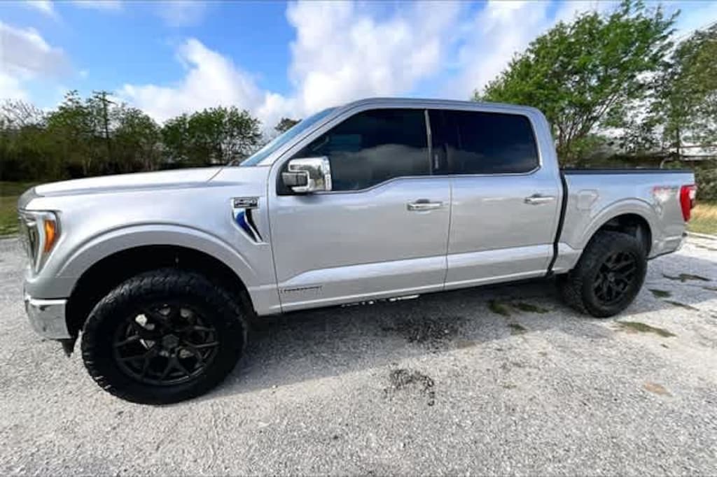 FRESH OIL CHANGE, 3.5L PowerBoost Full-Hybrid V6, 4WD, 18 Machined-Aluminum Wheels, 4-Wheel Disc Brakes, 6 Chrome Running Board, 7 Speakers, ABS brakes, Adjustable pedals, Air Conditioning, Alloy wheels, AM/FM radio: SiriusXM with 360L, Auto High-beam Headlights, Auto-dimming door mirrors, Auto-dimming Rear-View mirror, Automatic temperature control, Brake assist, Bumpers: chrome, Chrome 2-Bar Grille w/4 Minor Bars, Chrome Door & Tailgate Handles w/Body-Color Bezel, Chrome Single-Tip Exhaust, Chrome Skull Caps on Exterior Mirrors, Class IV Trailer Hitch Receiver, Compass, Connected Built-In Navigation, Delay-off headlights, Driver door bin, Driver vanity mirror, Dual front impact airbags, Dual front side impact airbags, Electronic Stability Control, Emergency communication system: SYNC 4 911 Assist, Equipment Group 502A High, Evasive Steering Assist, Exterior Parking Camera Rear, Ford Co-Pilot360 Assist 2.0, Front anti-roll bar, Front Center Armrest w/Storage, Front dual zone A/C, Front fog lights, Front reading lights, Front wheel independent suspension, Fully automatic headlights, FX4 Off-Road Package, Heated door mirrors, Heated front seats, Illuminated entry, Integrated Trailer Brake Controller, Intelligent Adaptive Cruise Control w/Stop & Go, Interior Work Surface, Intersection Assist, Lariat Chrome Appearance Package, Leather-Trimmed 40/20/40 Front Seat, LED Sideview Mirror Spotlights, Low tire pressure warning, Memory seat, Navigation system: Connected Navigation (90-Day Trial), Occupant sensing airbag, Outside temperature display, Overhead airbag, Overhead console, Panic alarm, Passenger door bin, Passenger vanity mirror, Pedal memory, Power door mirrors, Power driver seat, Power passenger seat, Power steering, Power Tailgate, Power windows, Pro Power Onboard - 7.2KW, Pro Trailer Backup Assist, Radio data system, Radio: AM/FM SiriusXM w/360L, Radio: B&O Sound System by Bang & Olufsen, Rear reading lights, Rear seat center armrest, Rear step bumper, Rear window defroster, Remote keyless entry, Security system, Speed control, Speed Sign Recognition, Speed-sensing steering, Split folding rear seat, Steering wheel mounted audio controls, SYNC 4 w/Enhanced Voice Recognition, Tachometer, Telescoping steering wheel, Tilt steering wheel, Traction control, Trailer Tow Package, Tray Style Floor Liner (47W), Trip computer, Turn signal indicator mirrors, Twin Panel Moonroof, Variably intermittent wipers, Ventilated front seats, Voltmeter, Wheels: 18 Chrome-Like PVD, Wheels: 20 Chrome-Like PVD, 3.5L PowerBoost Full-Hybrid V6, 4WD. Silver 2021 Ford F-150 Lariat 4WD 10-Speed Automatic 3.5L PowerBoost Full-Hybrid V6