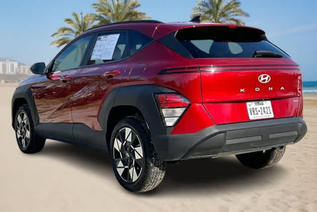 FRESH OIL CHANGE, 4-Wheel Disc Brakes, 6 Speakers, ABS brakes, Air Conditioning, Alloy wheels, AM/FM radio: SiriusXM, Apple CarPlay & Android Auto, Auto High-beam Headlights, Automatic temperature control, Brake assist, Bumpers: body-color, Cloth Seat Trim, Delay-off headlights, Driver door bin, Driver vanity mirror, Dual front impact airbags, Dual front side impact airbags, Electronic Stability Control, Emergency communication system: Bluelink+, Exterior Parking Camera Rear, Four wheel independent suspension, Front anti-roll bar, Front Bucket Seats, Front Center Armrest, Front dual zone A/C, Front reading lights, Fully automatic headlights, Heated door mirrors, Illuminated entry, Leather steering wheel, Low tire pressure warning, Occupant sensing airbag, Option Group 01, Outside temperature display, Overhead airbag, Panic alarm, Passenger door bin, Passenger vanity mirror, Power door mirrors, Power driver seat, Power steering, Power windows, Radio: AM/FM/HD Radio/SiriusXM Audio System, Rear anti-roll bar, Rear seat center armrest, Rear window defroster, Rear window wiper, Remote keyless entry, Security system, Speed control, Speed-sensing steering, Split folding rear seat, Spoiler, Steering wheel mounted audio controls, Tachometer, Telescoping steering wheel, Tilt steering wheel, Traction control, Trip computer, Turn signal indicator mirrors, Variably intermittent wipers, Wheels: 18 x 7.0J Glossy Black Alloy. 26/29 City/Highway MPG Ultimate Red Metallic 2025 Hyundai Kona SEL AWD CVT 2.0L I4 DOHC 16V
